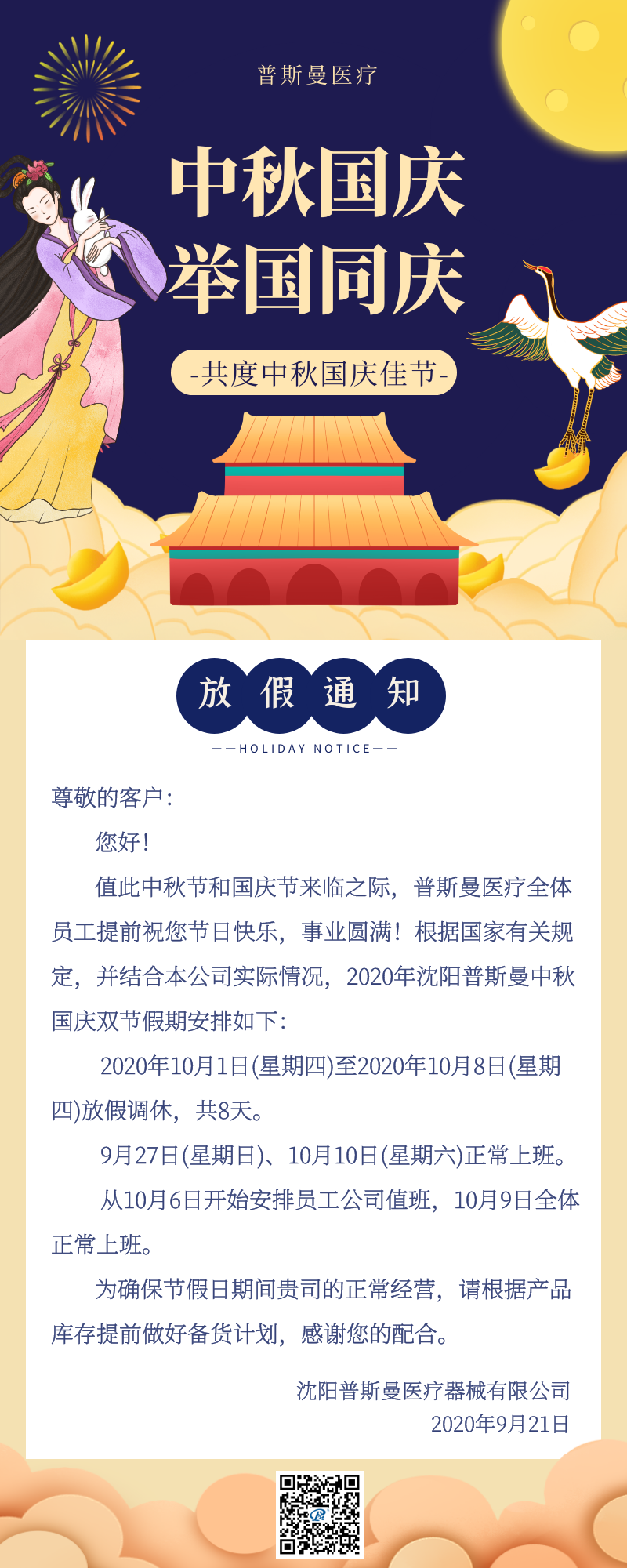 Sep 29,2020 中秋国庆,举国同庆 尊敬的客户: 您好! 值此中秋节和国庆节来临自己,普斯曼医疗全体员工提前祝您节日快乐,事业圆满! 关于我们 沈阳普斯曼医疗器械有限公司创立于2006年,是一家集研发、制造和销售为一体的专业化企业,依据国家标准专业生产医疗器械。 医用电动锯钻系列;进口无刷电机系列;国产高品质无刷电机系列;医用电钻摆锯一体多功能系统;手足踝专用系统;椎弓根钉拧入专用动力;外固定针拧入专用动力;外固定架系列;骨水泥套管;骨水泥枪及其他骨科手术器械等。 联系我们 电话:024-2351 9517 传真:024-2351 9517 邮箱:info@pusm-medical.com 更多产品详情,请浏览:www.sypsm.com previous 什么是霜降 next 欢迎来到普斯曼 2018——世界医学论坛
