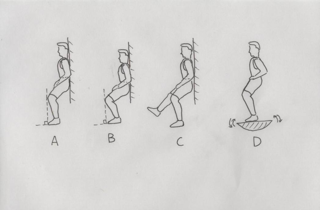 借助弹力带,将一端固定于墙上,另一端绑在右膝盖上方,走几步将弹力带拉紧,保持左腿伸直,右膝稍屈曲(如下左图);呼气将右膝伸直,右脚跟着地;吸气将右膝缓慢屈曲至起始位(如下右图);重复2-3组,每组10次。换另外一只腿如此重复。