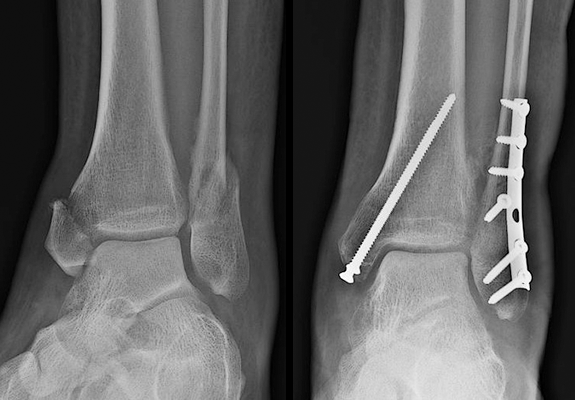 踝关节任何平面超过10°的畸形,无论是单一的、多平面的还是旋转的,均会导致异常的机械负荷,并且影响踝关节的功能和软骨的营养,进一步发展将导致关节退化,因此对该类患者均应行踝上截骨术矫正畸形。胫骨远端截骨可以恢复踝关节解剖结构,重新分配踝关节负荷,改善踝关节的生物力学性能。建议行踝上截骨术时稍稍过度矫正,预留足够的反弹空间。旋转和成角畸形的中心可通过交叉胫骨远、近端的机械轴来确定,若在此中心行踝上截骨术,可在不平移任何远端片段的情况下矫正畸形;若截骨位置高于或低于此中心(如关节内畸形),须保证远端片段与机械轴相适应,以免继发变形。有研究报道,应用踝上截骨术治疗踝关节原发性骨关节炎和创伤性骨关节炎患者的效果显著。踝上截骨术的适应证包括关节保留完整、有内翻畸形或外翻畸形、任何平面超过10°的畸形。外伤后骨折不愈合会导致踝关节负荷增加给患者带来疼痛。若踝关节状态尚可,也可行关节周围截骨或辅助韧带重建术治疗慢性韧带不稳定伴轻、中度退行性变。