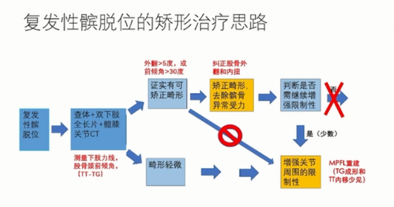Dejour三联疗法方案但从矫形的角度思考,此治疗体系未考虑对整体下肢力线和扭转关系的分析,属于局部解决方案,并没有解决异常受力。对于存在明确畸形的患者,短期可能收获一定疗效,而过度的异常受力,使得长期更容易并发髌股关节炎。因此,这种方法仅适用于畸形轻微的病例,对于畸形明显的病例,更适用于矫形的原则。