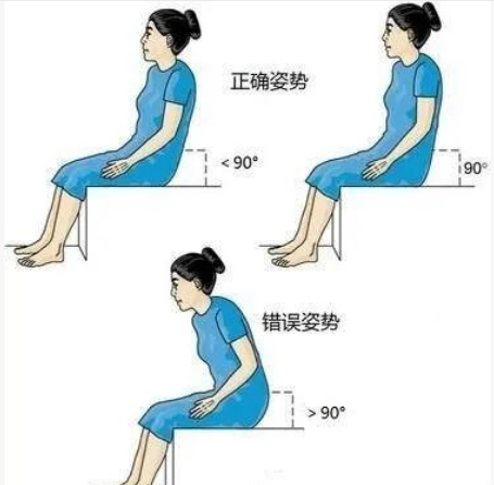 ②保持膝关节低于或等于髋部,不宜坐过低的椅子、沙发,双脚不能交叉,不能跷二郎腿;