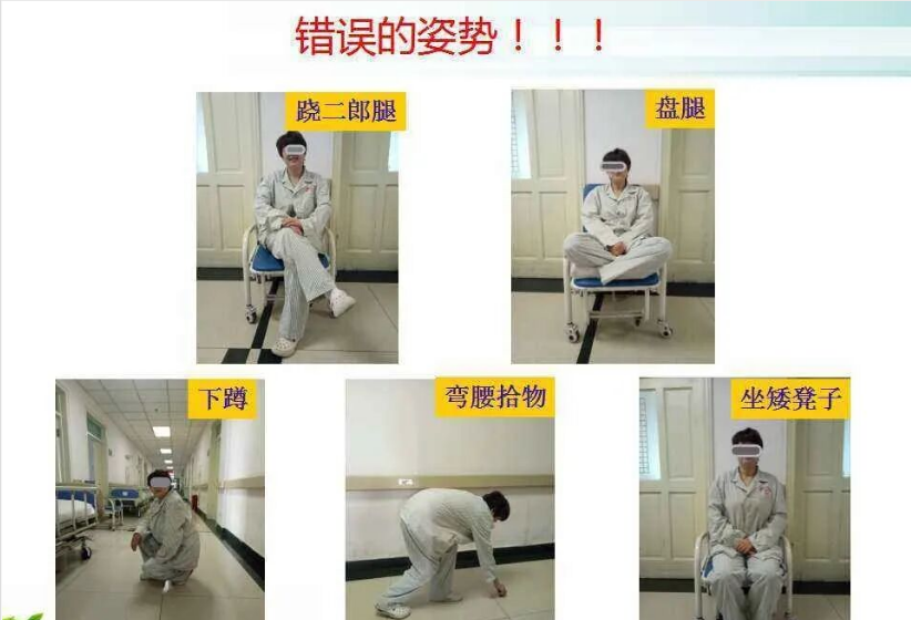 (3)尽量避免以下动作:髋关节内收、内旋位时自坐位站起;双膝并拢、双足分开时,身体向患侧倾斜,去取东西、接电话等;翘二郎腿和坐位穿鞋;入厕时坐便桶过低,或沙发过矮,健侧翻身不当时患侧髋关节过于伸直、内收内旋位。